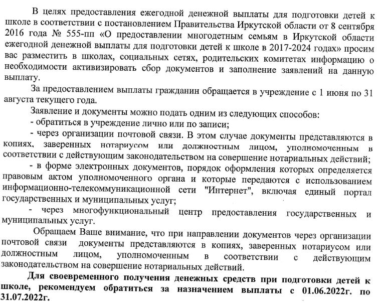 Обращаем Ваше внимание, что для назначения данной меры социальной поддержки предусмотрен срок для принятия решения 20 календарных дней, поэтому для своевременного получения денежных средств при подготовки детей к школе, рекомендуем обратиться за назначением выплаты с 01.06.2022г. по 31.07.2022г.