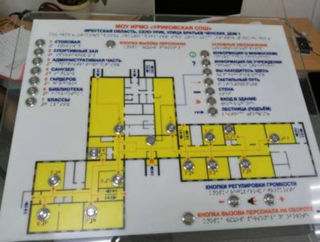 На входе в здание находится тактильно-звуковая мнемосхема для организации передвижения по школе лиц с нарушениями слуха и зрения.