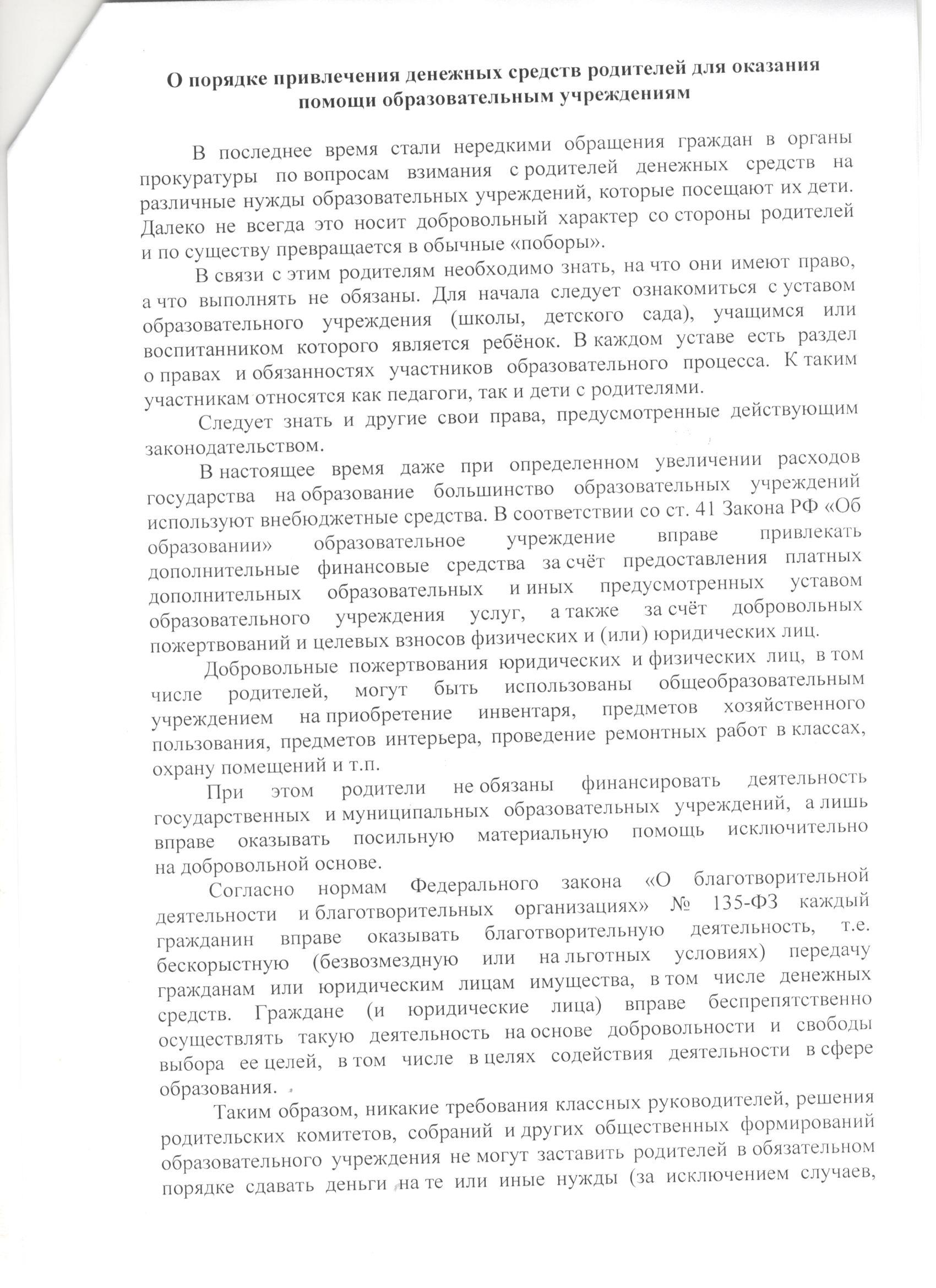 О порядке привлечения денежных средств родителей для оказания помощи образовательным учреждениям